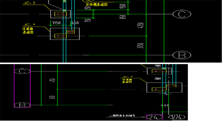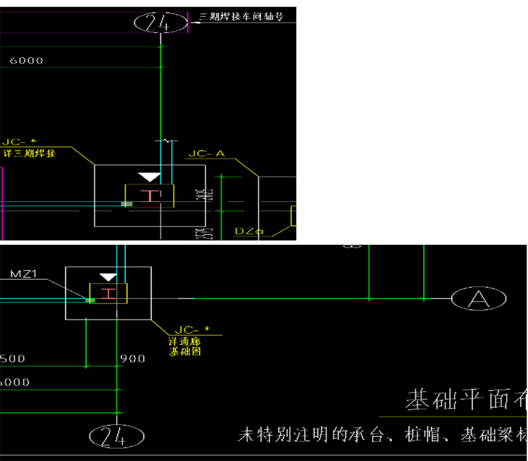 33、零部件焊接厂房结构图,基础平面图中○24/○A轴基础引出标识为详通廊基础图,而雨棚结构图基础平面图(一)中此位置注明详三期焊接,基础平面图(二)中无此处基础,此处基础及短柱具体做法?