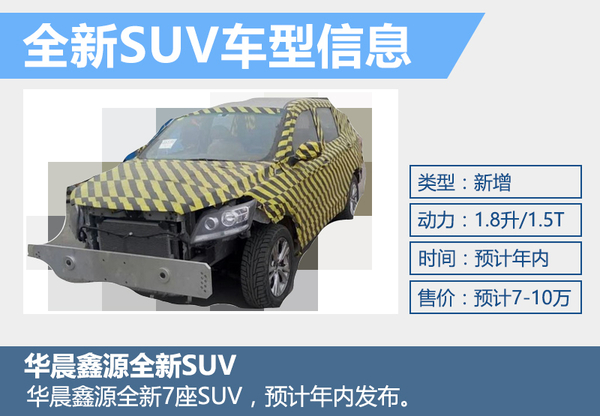 华晨鑫源是华晨汽车旗下的一家合资自主品牌,多年来主要在商用车领域发展。按照华晨鑫源规划,在今年进军乘用车市场,形成商乘两大市场共线发展,多款新车将陆续投放市场。网通社获得了一组华晨鑫源首款7座SUV的谍照,这款车代号为Y101,将搭载1.8L和1.5T两台发动机。新车有望在年内正式上市,上市后预计7万元起售。
