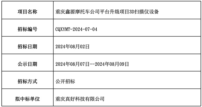 重庆鑫源摩托车公司平台升级项目3D扫描仪已完成招标流程,现公示中标结果如下: