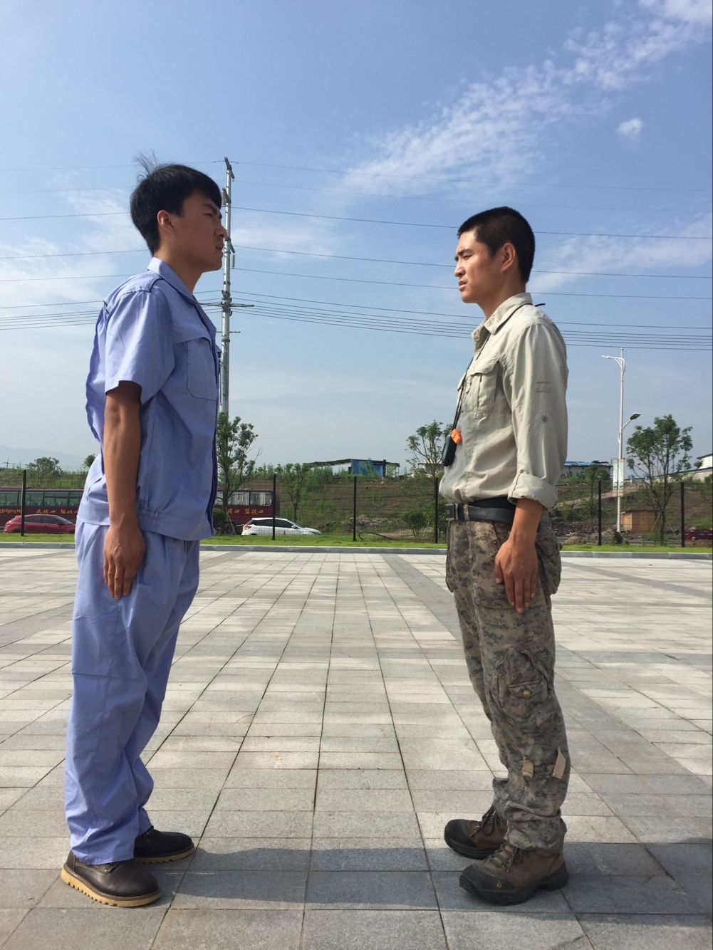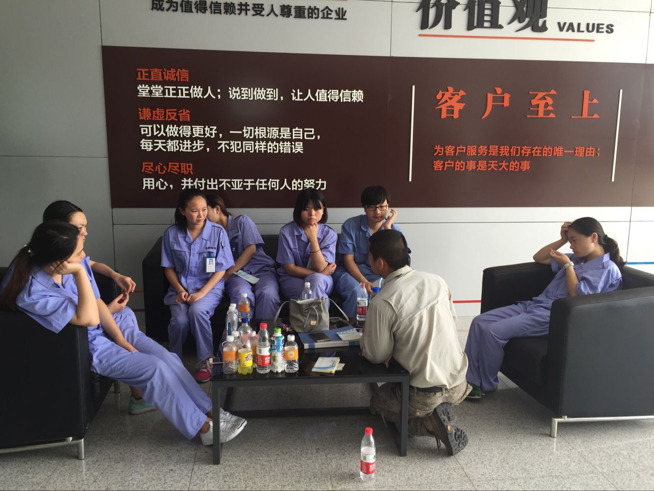 (教官对身体不适的员工进行场外辅导)