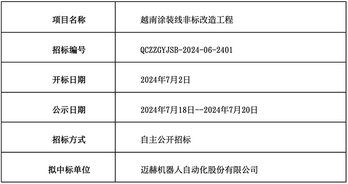 越南公司涂装线非标改造工程项目已完成开评标流程,现公示中标结果如下: