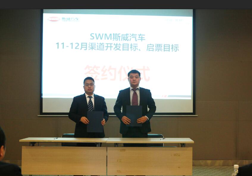 鑫源控股副总裁兼销售公司总经理张洪岩与SWM斯威品牌事业部品牌总监助理白松签订目标责任书