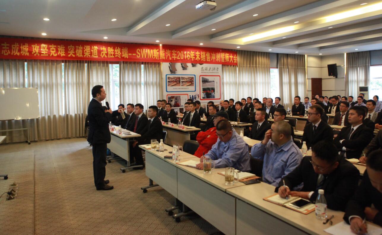 目标的完成当然是离不开我们不断的学习与总结。在10月29日SWM斯威汽车2016年末销售冲刺誓师大会召开之前,SWM斯威品牌事业部12个大区的大区及区域经理就渠道建设、销售管理、品牌传播、市场推广、1.5T产品的卖点及相关传播策略等方面进行了为期三天的学习与交流。驻外人员与驻内人员就以上方面前期的工作进行了梳理,对日常工作的常见问题进行了沟通,对后期的工作进行了安排。鑫源控股副总裁兼销售公司总经理张洪岩先生全程参与了学习,现场与大家进行交流。通过三天的学习,所有人员对自己的工作都有了清晰的认识,同时也对以后的工作提出了新的要求,力争在后期的工作中规避不足,通过我们每一个人的努力提升SWM斯威品牌的品牌形象。