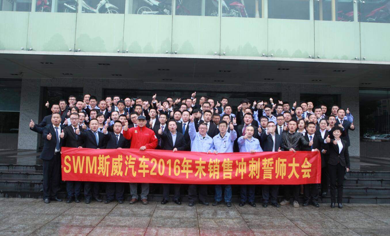 2016年的脚步已接近尾声,斯威人为了年度目标而冲刺,人人责无旁贷。2016年10月29日,SWM斯威汽车2016年末销售冲刺誓师大会暨11月、12月渠道开发目标、启票目标责任书签订仪式在含谷生产基地隆重召开。