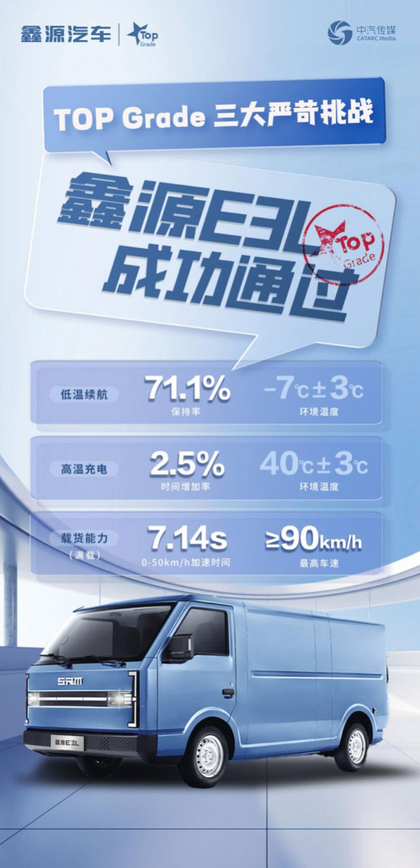鑫源E3L在由行业权威机构——中汽中心举行的“2024Top Grade顶级品质挑战”极限测试中,在严苛的测试条件下成功通过“低温续航、高温充电和载货能力”三种工况测试并取得优异成绩。鑫源E3L在低温续航保持续率、高温充电时间及满载加速的多项测试中,均取得优异的成绩,这不仅得益于鑫源E3L优异的性能,也是搭载新一代宁德时代电池的出色表现。