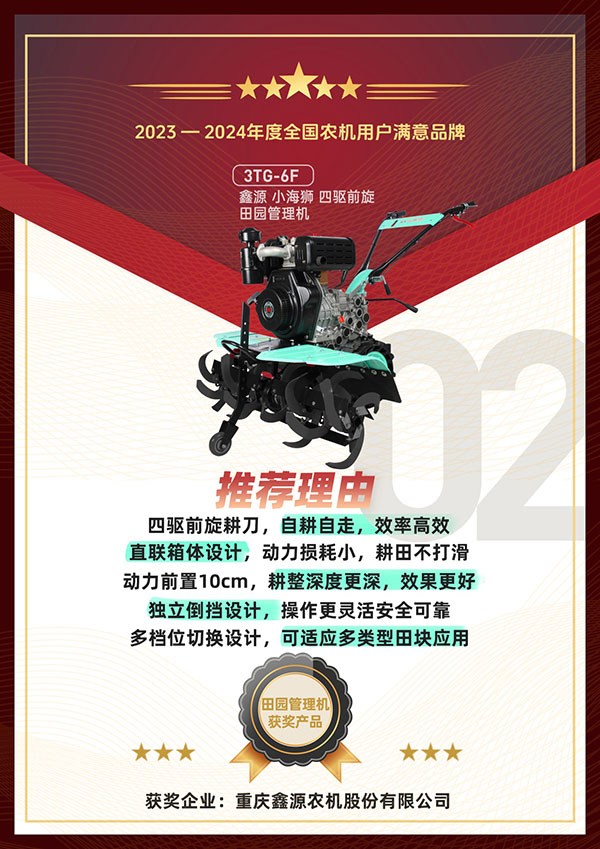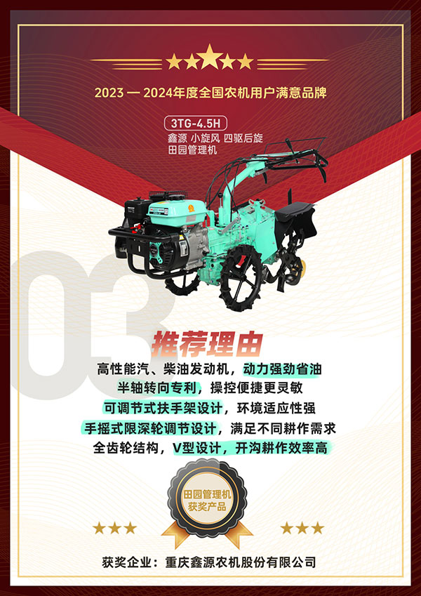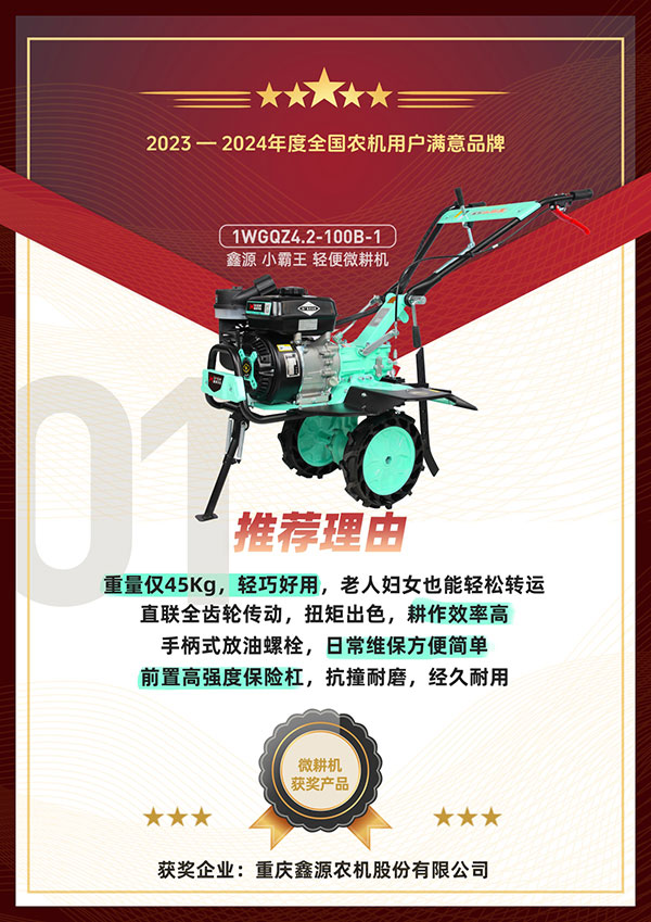 重庆鑫源农机股份有限公司以良好的产品销量顺利入围活动并参与评选。主办方通过问卷调查、用户投票以及专家评审等层层维度开展了严格筛选,最终鑫源小霸王轻便微耕机、鑫源小海狮四驱前旋田园管理机、鑫源小旋风四驱后旋田园管理机等产品凭借众多的用户好评,优秀的产品性能和质量成功荣获2023-2024年度全国农机用户满意品牌。
