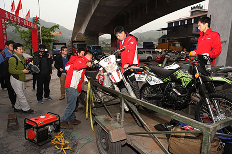 得到龚大兴董事长指示后,鑫源摩托越野救护队在加急准备物资的同时,前往抗震救灾的救护队员也在加紧集结,并很快形成了以孙童为队长,曹应洪、王翼荣、刘小兵、野人、廖智、廖智妈妈,以及笔者在内的八名抗震救灾救护队员。这批救援队由“赛阿盟俱乐部”的国际专业赛车手组成,他们曾经都获得过国内各项国家级专业赛冠军。