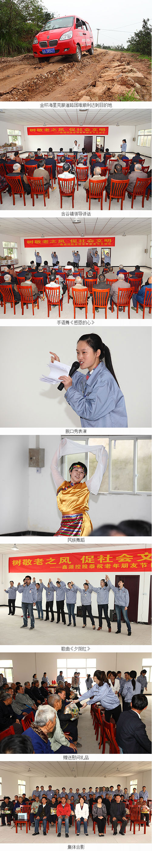 树敬老之风 促社会文明——尊老、敬老、爱老是中华的传统美德。在得知本次活动后鑫源公司大批员工踊跃报名参加,他们牺牲中午午休时间,认真积极排练节目。10月19日一早,鑫源公司的文艺骨干们就高高兴兴踏上了前往寨山坪敬老院的征程。雨后的盘山公路特别颠簸,但是丝毫没有影响到大家的热情。到达目的地后,大家都积极搬卸慰问礼品和对文艺表演大堂进行了简单布置。在含谷镇领导和鑫源公司外联部曹部长的开场讲话之后,鑫源文艺队的队员们就开始亮相“演出”了。首先由手语舞《感恩的心》为表演拉开了帷幕,随后歌曲《好运来》、脱口秀表演、载歌载舞的《卓玛》、温馨感人的《夕阳红》……没有灯光,没有舞台,大家都表演的非常认真,每个节目都有板有眼,老人们也看得津津有味。