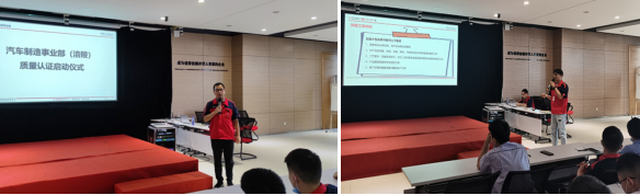 本轮质量认证范围包含涪陵基地冲压、焊装、涂装、总装四大车间,启动会在激昂澎湃的《鑫源之歌》中拉开序幕。首先由质量控制部副部长张伟对生产系统质量绩效评价方案以及认证方案进行解读,要求各车间进一步明确质量目标,按目标开展工作行动,提升制造质量水平。接着汽车制造事业部质量总监苏总对活动认证背景进行说明及做出动员讲话,最后开展了理论认证的培训及测评。