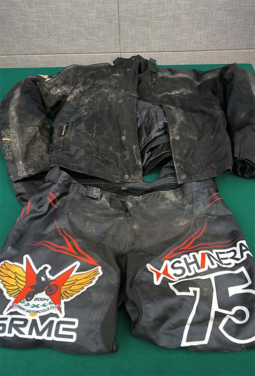 捐赠现场有一件黑色的骑行夹克衫特别引人注目,这件衣服的前胸、领口、袖口等布满了白灰色的汗渍,透过这件衣服,仿佛能看到车手们奋战在汶川抗震救灾现场的情景。