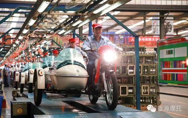 2015年3月30日,万众期待的鑫源复古边三轮(挎子,XY400B)头戴大红花,在鑫源摩托生产车间生产三线隆重下线。鑫源摩托公司总经理钟秉福先生、国内营销部总经理余波等高层领导、研发团队以及生产团队出席了本次下线仪式。
