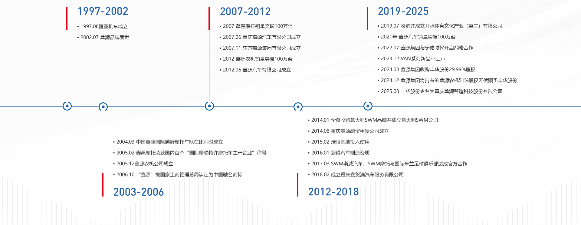 东方鑫源集团有限公司(简称鑫源集团)始创于1997年,是一家涉及工业制造、金融服务、智慧出行等多个领域的大型企业。经过多年的发展,现在形成以汽车、高端摩托车、农机通机、智慧出行+融资租赁的4+1产业融合发展平台。并以重庆涪陵制造基地、重庆高新区制造基地、越南制造基地、SWM意大利制造基地+重庆涉外商务区总部的4+1地域布局,现有员工1万余名。
